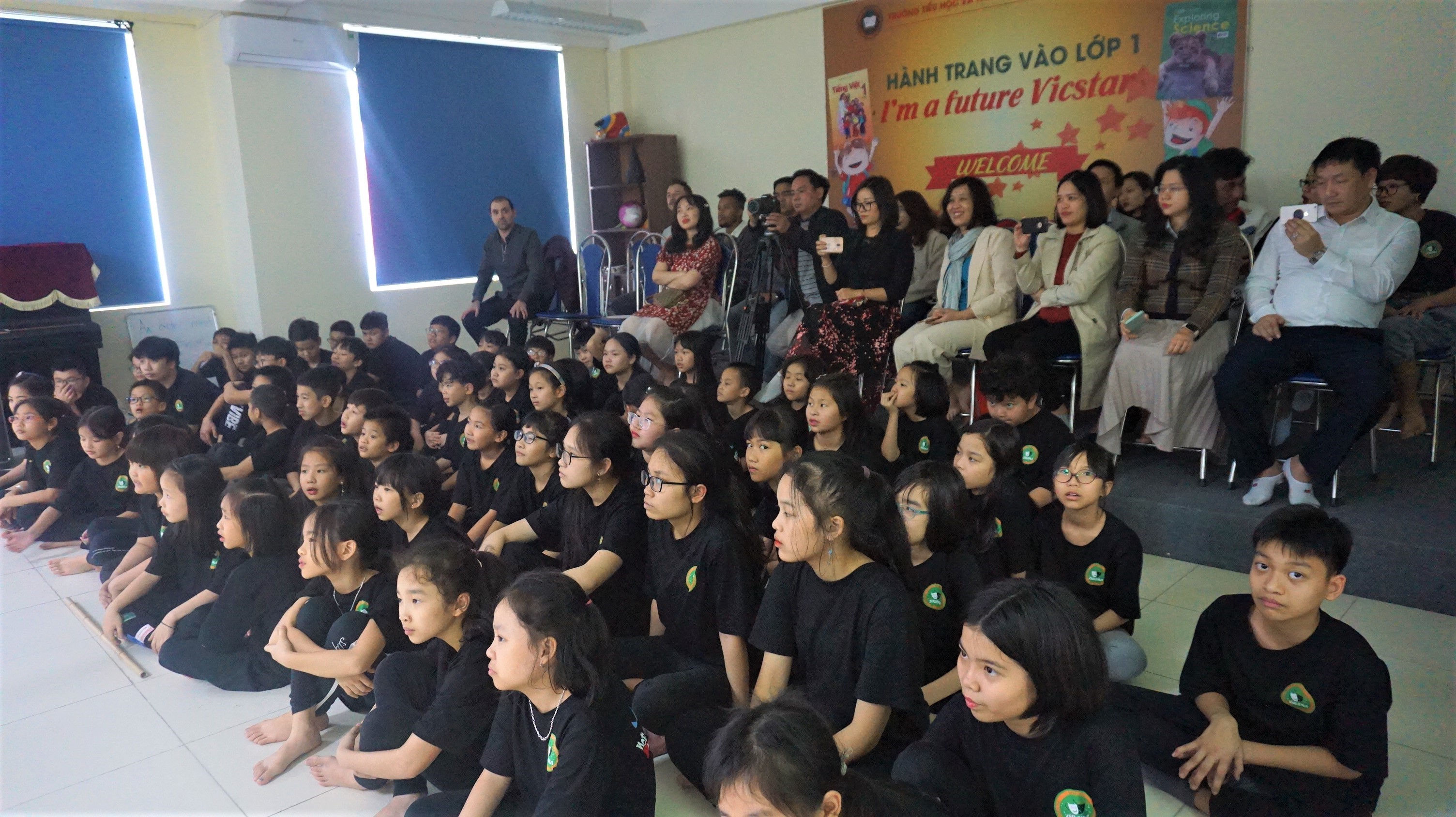 Màn trình diễn đầu tiên đến từ các Vicstars lớp 3V2 với trích đoạn trong câu truyện “Ếch hô mưa”. Với trích đoạn ngắn này, chúng tớ sẽ tái diễn lại hình ảnh của nước và lửa, thông qua các chuyển động và sự di chuyển cơ bản đã được học với bộ môn Kịch nghệ trong suốt thời gian qua. Đây cũng là cách giúp chúng tớ hiểu rõ hơn về các từ vựng trong bài học của mình.