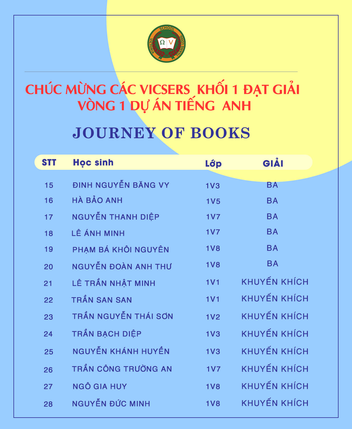Trường TH & THCS Victoria Thăng Long xin được chúc mừng 60 Vicsers có tên dưới đây đã đạt giải ở Vòng 1 Dự án Tiếng Anh “Journey of Books” với tổng cộng 07 giải Nhất, 14 giải Nhì, 19 giải Ba và 20 giải Khuyến khích: