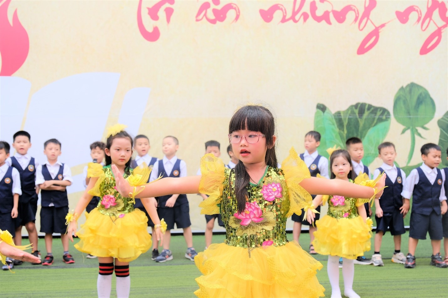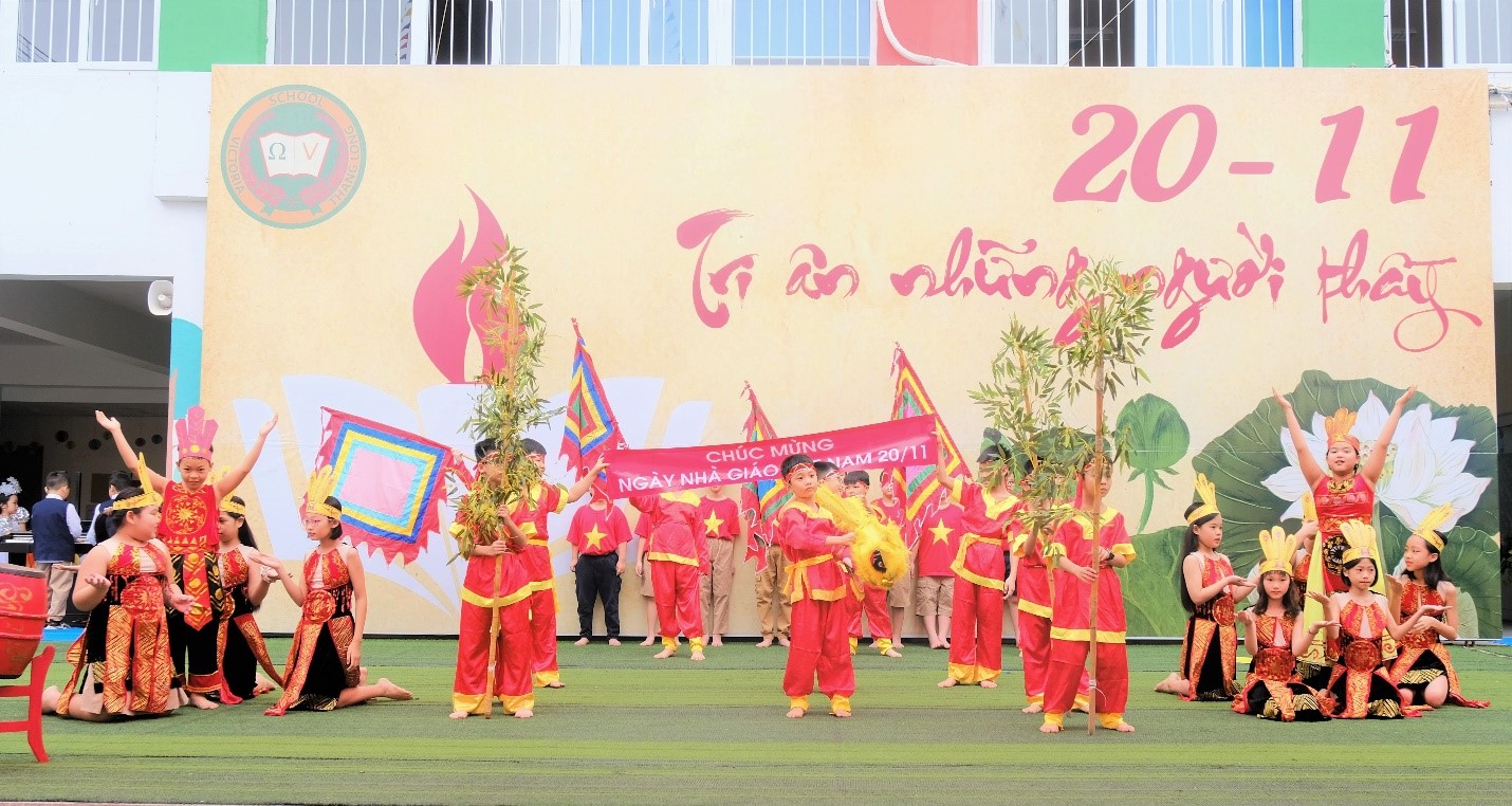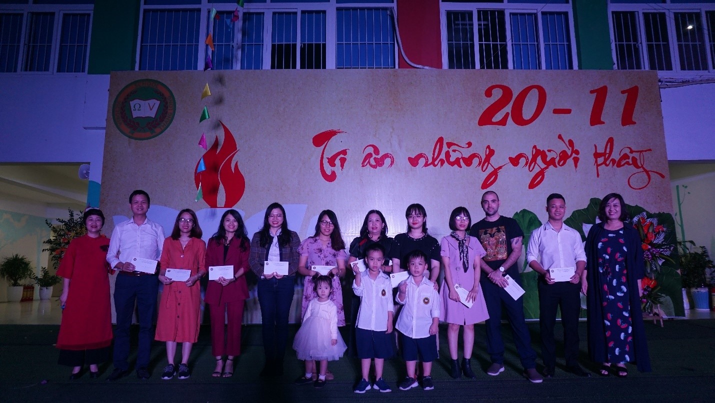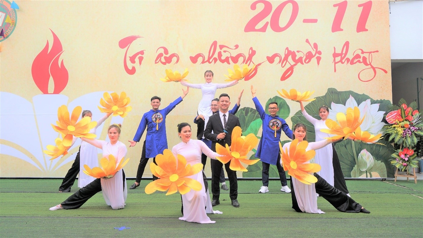 Mở đầu buổi lễ, cô Nguyễn Thị Ngân Hoa – Hiệu trưởng Nhà trường đã phát biểu và nhắc nhở học sinh về lòng biết ơn và ghi nhớ truyền thống dân tộc. Bà Nguyễn Thị Uyên Lan – đại diện cha mẹ học sinh toàn trường đã cảm ơn, tri ân, tặng hoa các thầy cô Nhà trường.