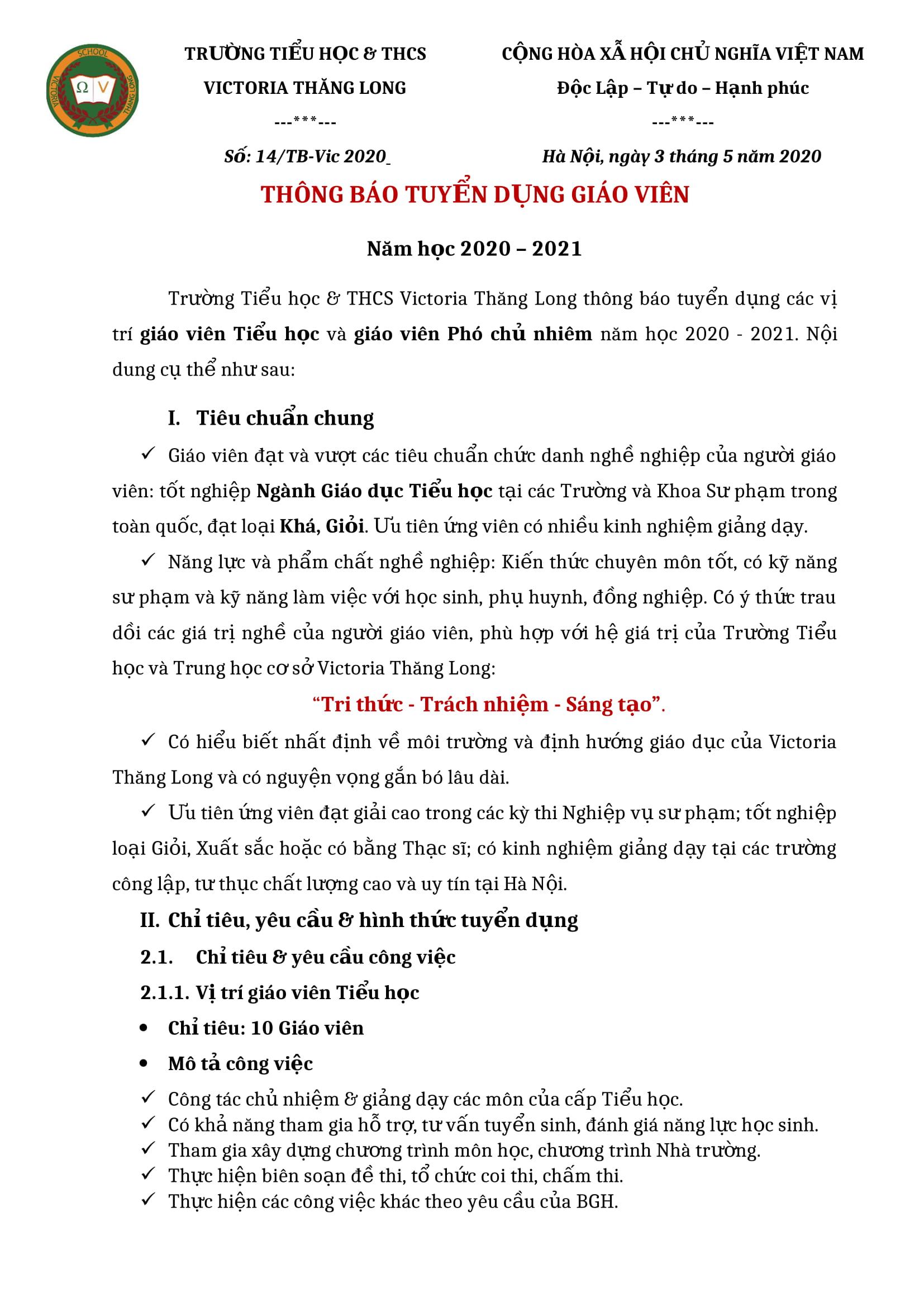 Thông báo tuyển dụng Giáo viên – Năm học 2020 – 2021