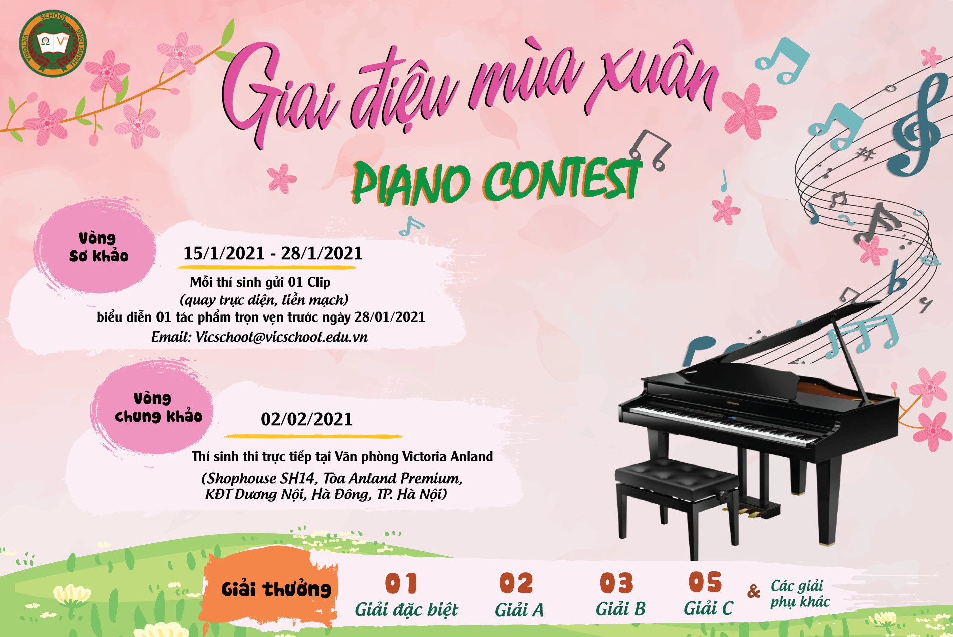 Trường TH & THCS Victoria Thăng Long trân trọng gửi tới Quý phụ huynh và các em học sinh thông tin về cuộc thi “Giai điệu mùa xuân – Piano Contest”.