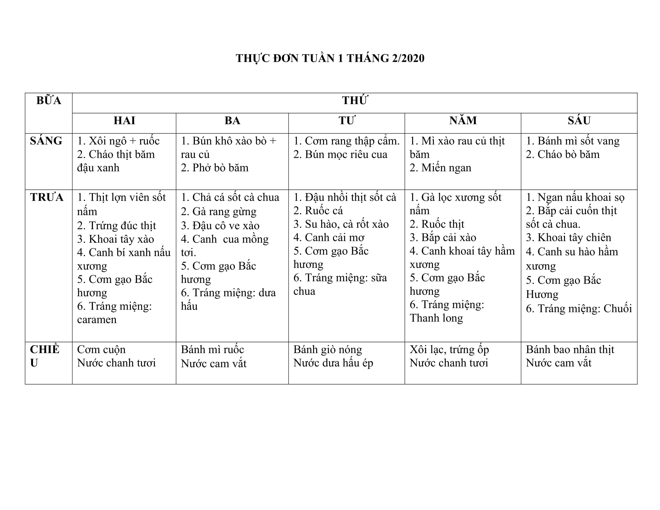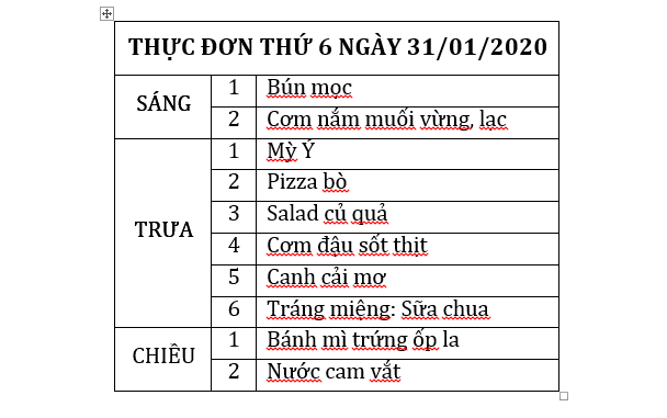Thực đơn ngày 31/01/2020 và tuần 1 tháng 2 năm 2020