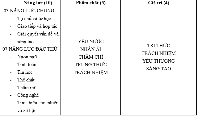 Học sinh Victoria Thăng Long sẽ được học tập và rèn luyện trong một môi trường giáo dục hiện đại để đạt tới 10 năng lưc, 5 phẩm chất, 4 giá trị cốt lõi theo bảng dưới đây: