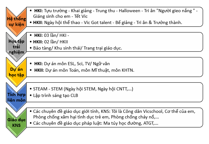 Hệ thống sự kiện, dự án học tập được tổ chức trong năm học với các nội dung phong phú, bám sát chủ đề và nội dung các môn học trong chương trình chính khóa.