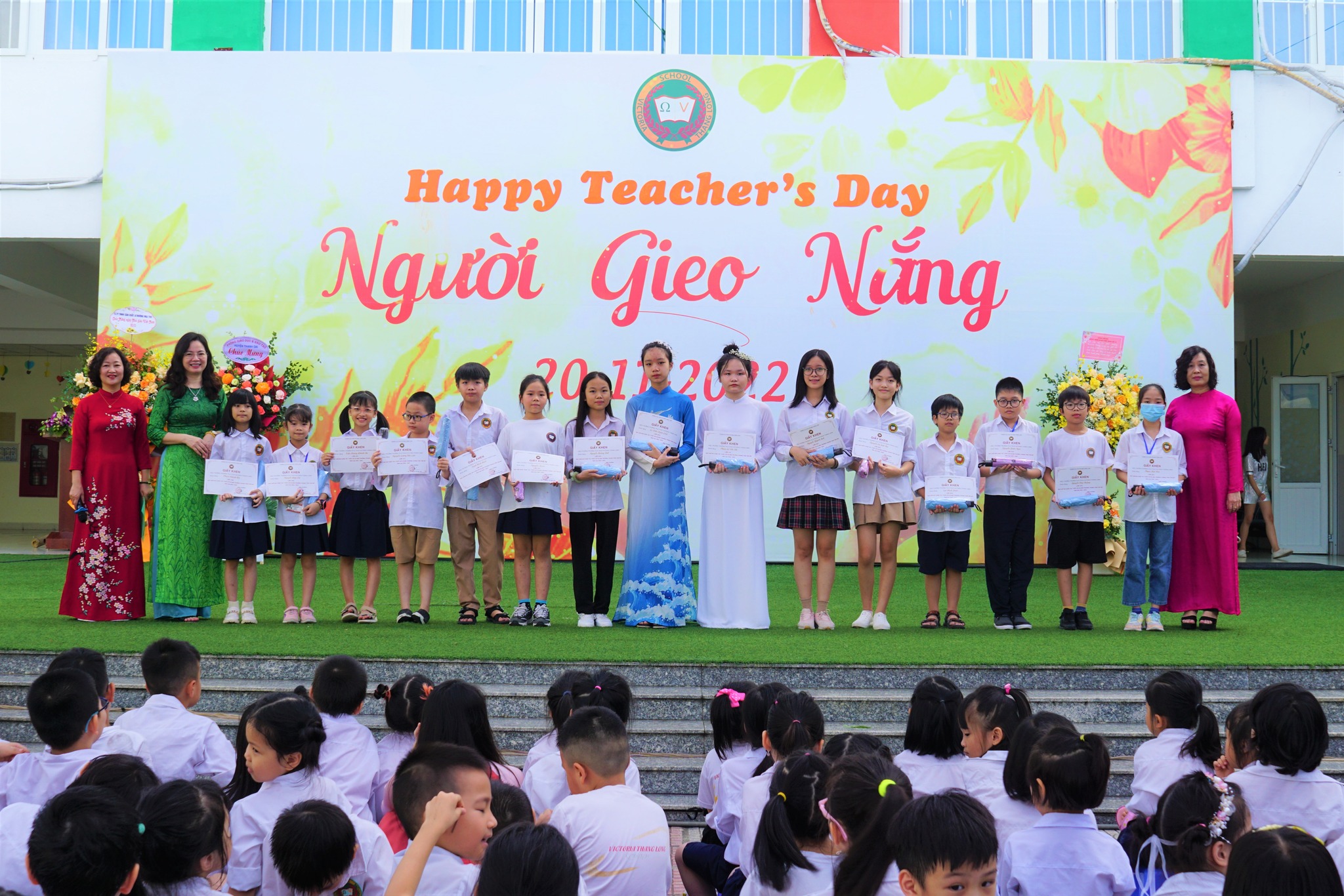 Buổi lễ thêm phần long trọng với phần tuyên dương, khen thưởng học sinh đạt giải trong cuộc thi “Mái trường, thầy cô trong trái tim em” và các tiết mục đạt giải tại Hội diễn văn nghệ chào mừng ngày Nhà giáo Việt Nam 20/11. Nụ cười của các bạn học sinh chính là và niềm vui của thầy cô giáo trong mùa tri ân này. Những lời ca yêu thương về tình thầy trò đã được cất vang, những tiết mục sôi động được trình diễn, tất cả làm nên một buổi Lễ kỷ niệm thật đáng nhớ và trọn vẹn.