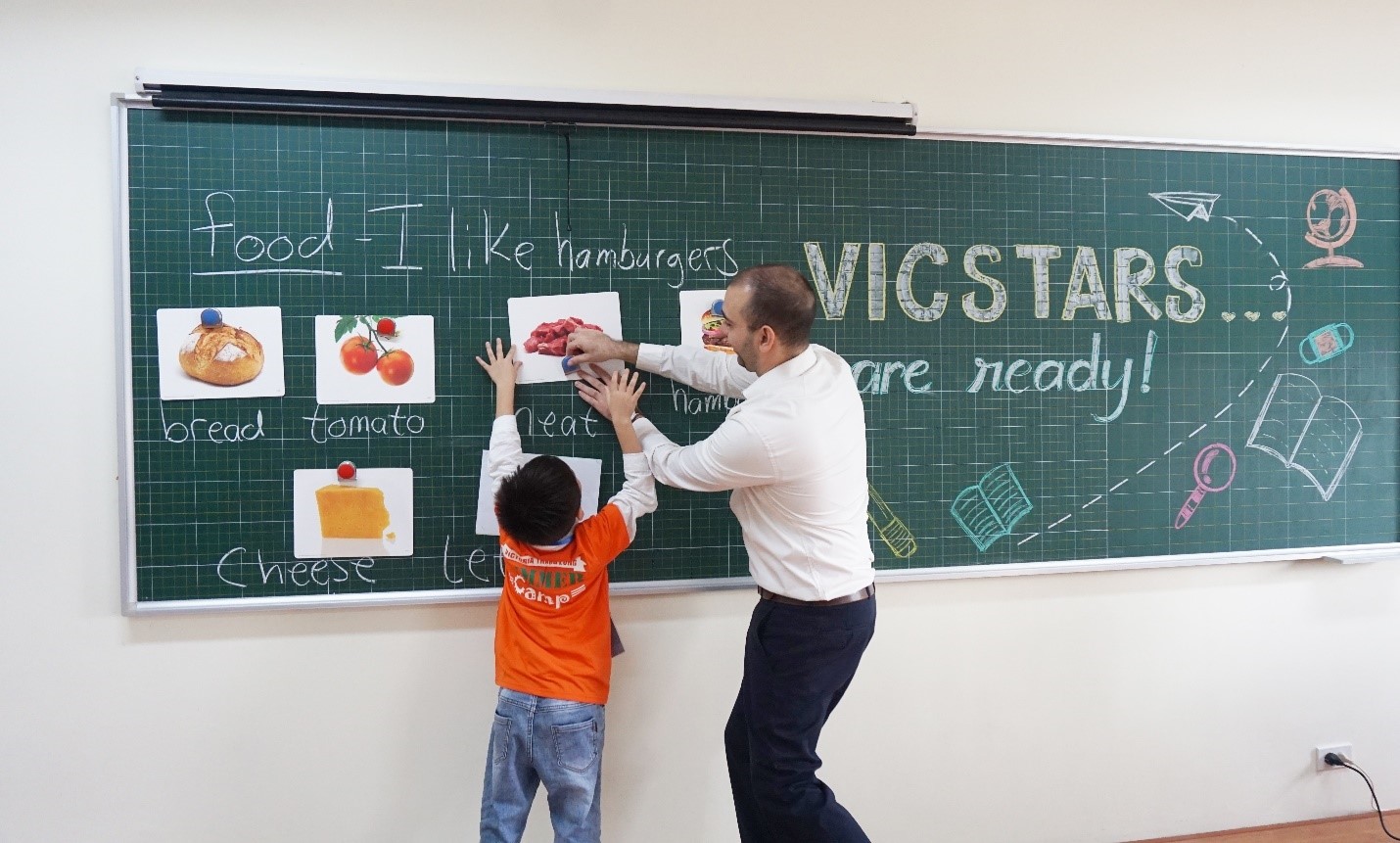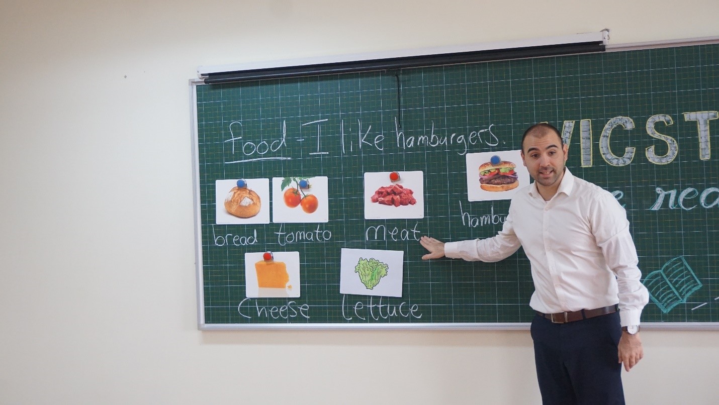 Tiết học đầu tiên là môn Tiếng Anh cùng với thầy Aidan – giáo viên bản ngữ đến từ nước Mỹ. Chúng tớ vừa được học Tiếng Anh, vừa có thêm kiến thức về các món ăn trong đời sống hàng ngày đó. Thật là hay ho và thú vị phải không nào?