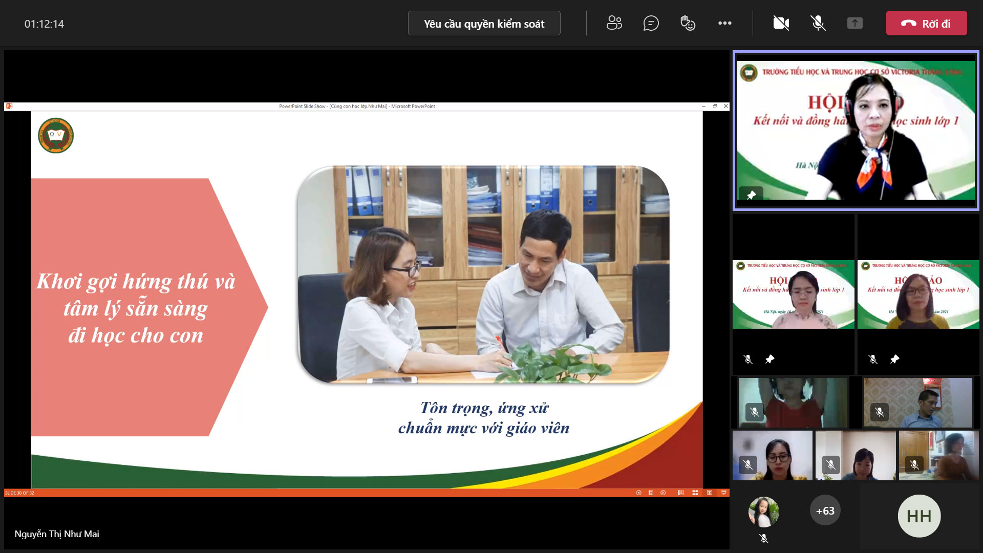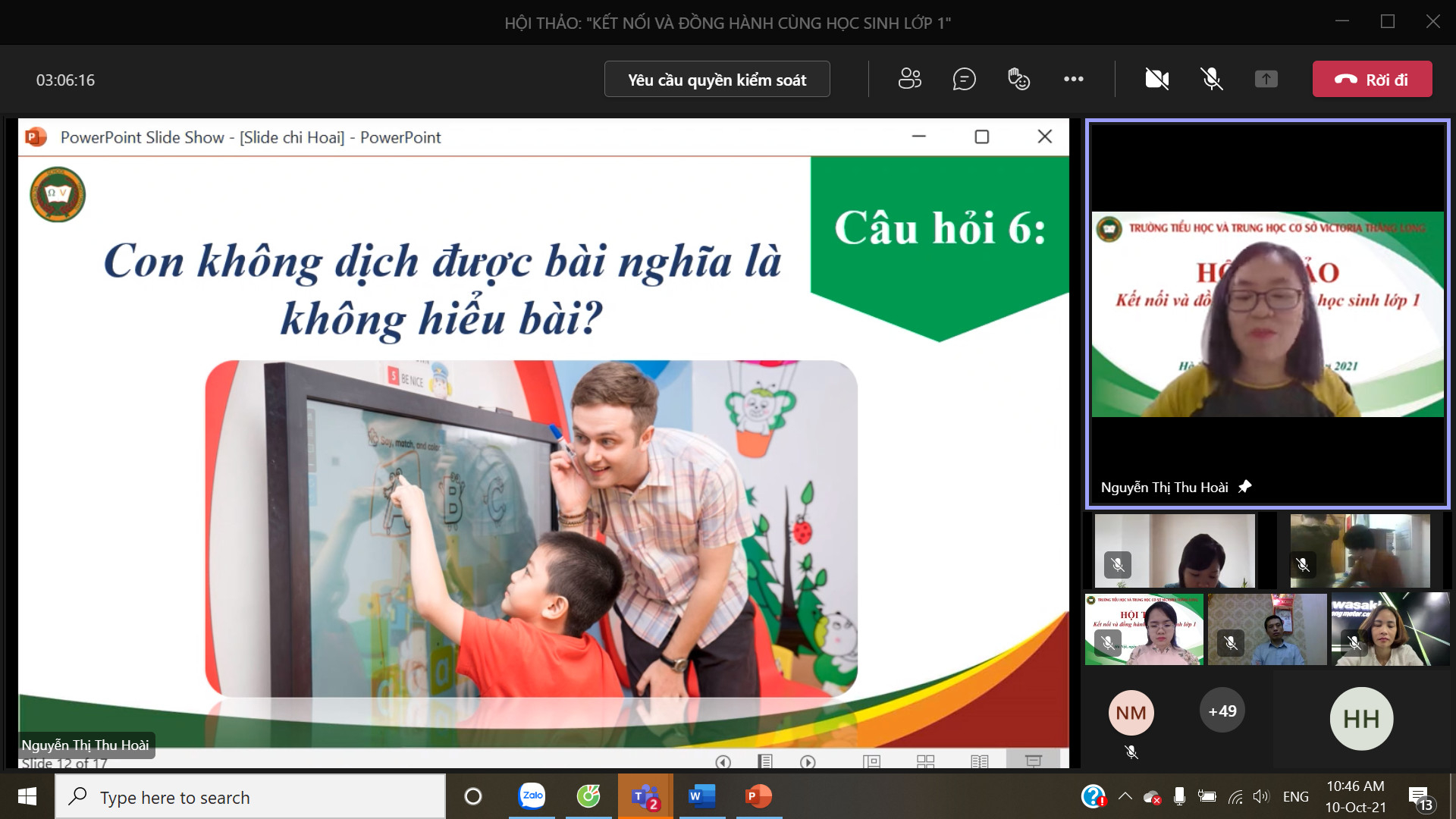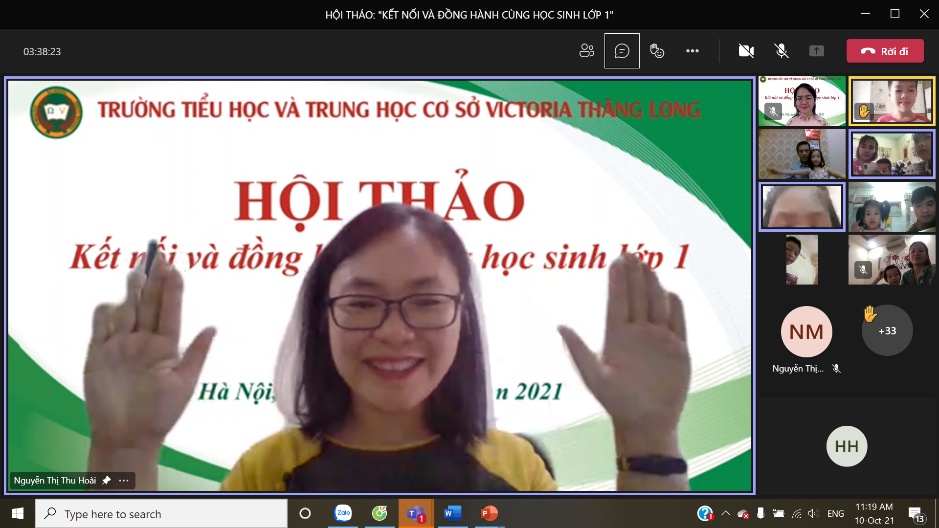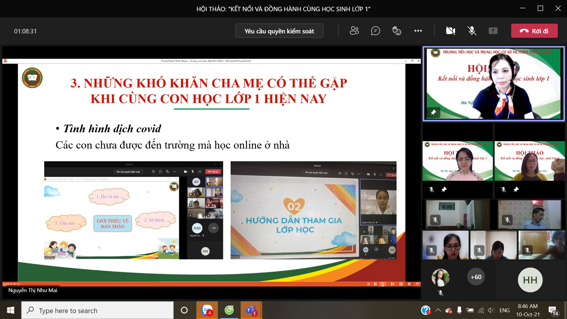 8h00 ngày 10/10/2021 Trường Tiểu học và Trung học cơ sở Victoria Thăng Long đã tổ chức Hội thảo trực tuyến chia sẻ, tư vấn với chủ đề: “Victoria Thăng Long đồng hành cùng học sinh lớp 1”. Buổi Hội thảo được tổ chức trên nền tảng Microsoft Teams và phát trực tiếp trên kênh Fanpage của Nhà trường đã thu hút được sự quan tâm của đông đảo của quý vị phụ huynh và thầy, cô giáo.
