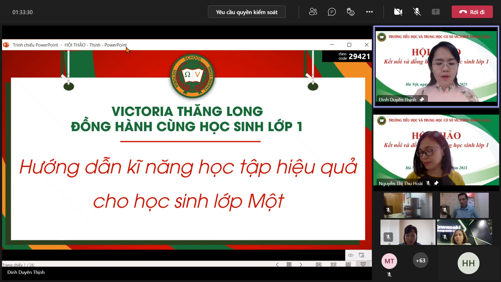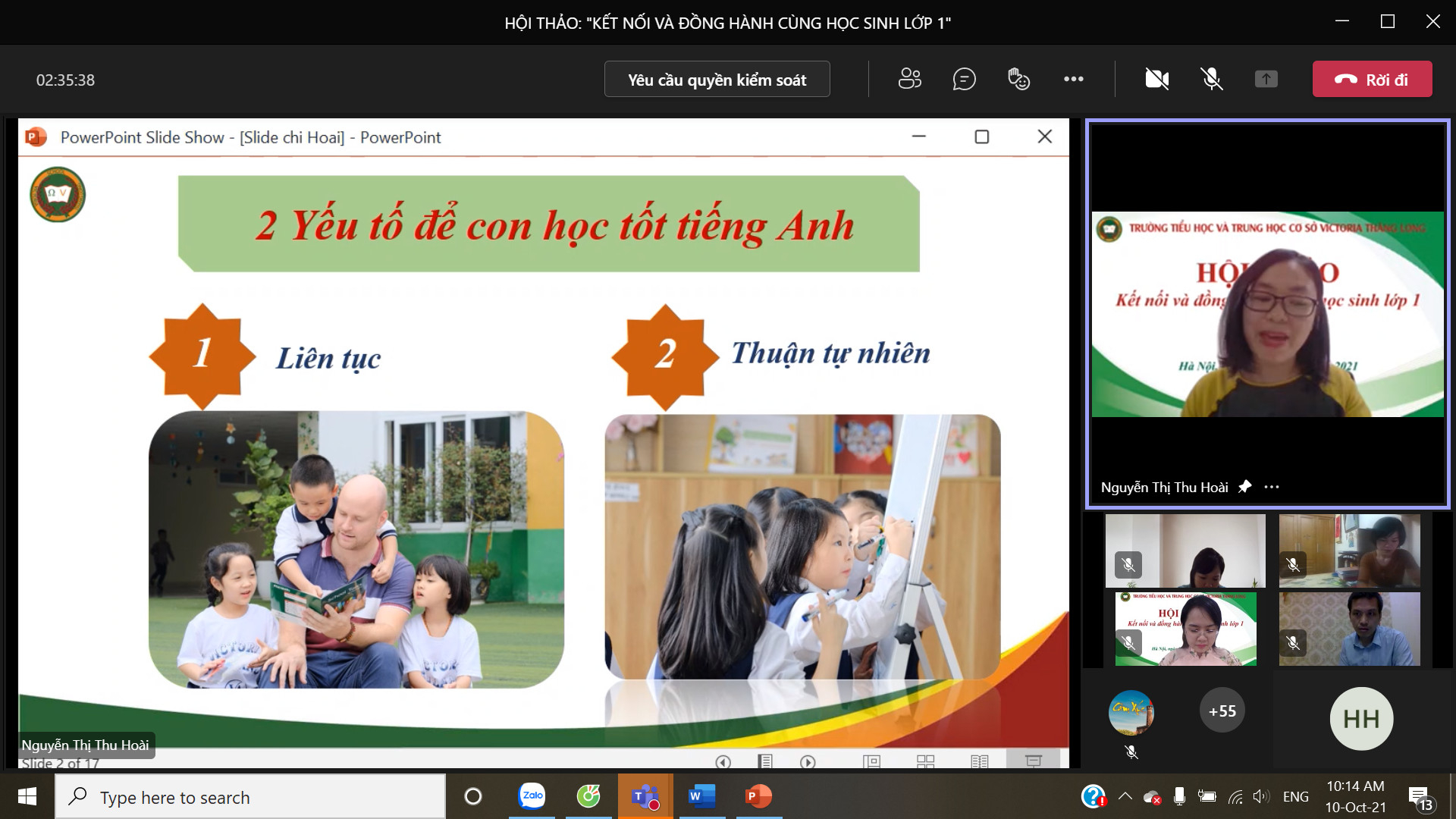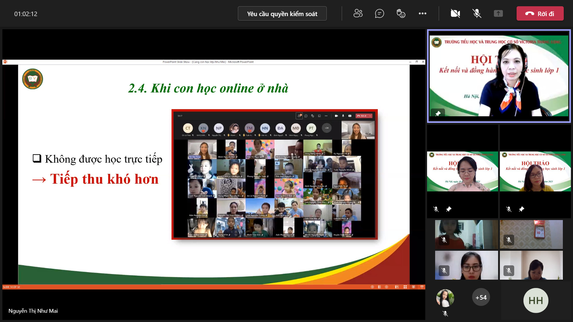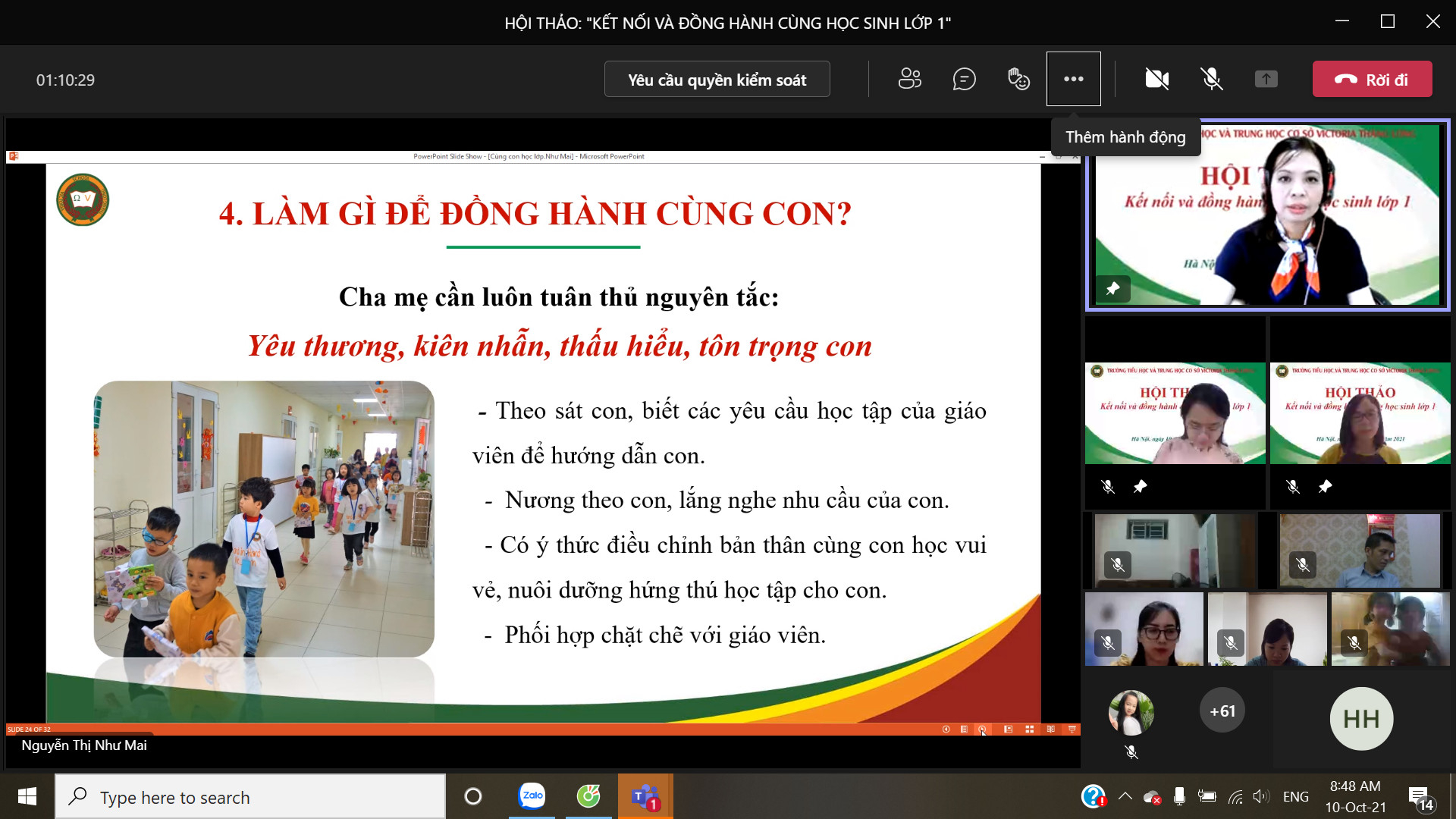 8h00 ngày 10/10/2021 Trường Tiểu học và Trung học cơ sở Victoria Thăng Long đã tổ chức Hội thảo trực tuyến chia sẻ, tư vấn với chủ đề: “Victoria Thăng Long đồng hành cùng học sinh lớp 1”. Buổi Hội thảo được tổ chức trên nền tảng Microsoft Teams và phát trực tiếp trên kênh Fanpage của Nhà trường đã thu hút được sự quan tâm của đông đảo của quý vị phụ huynh và thầy, cô giáo.