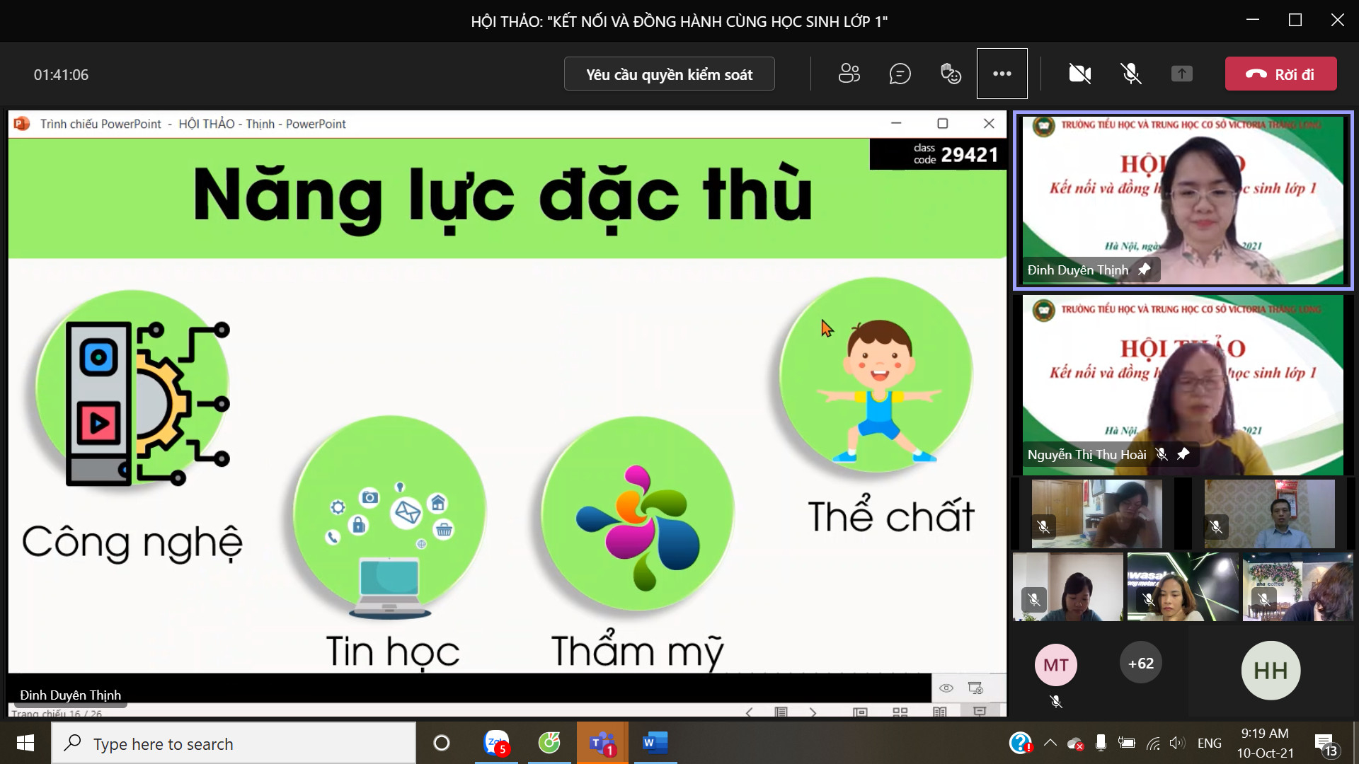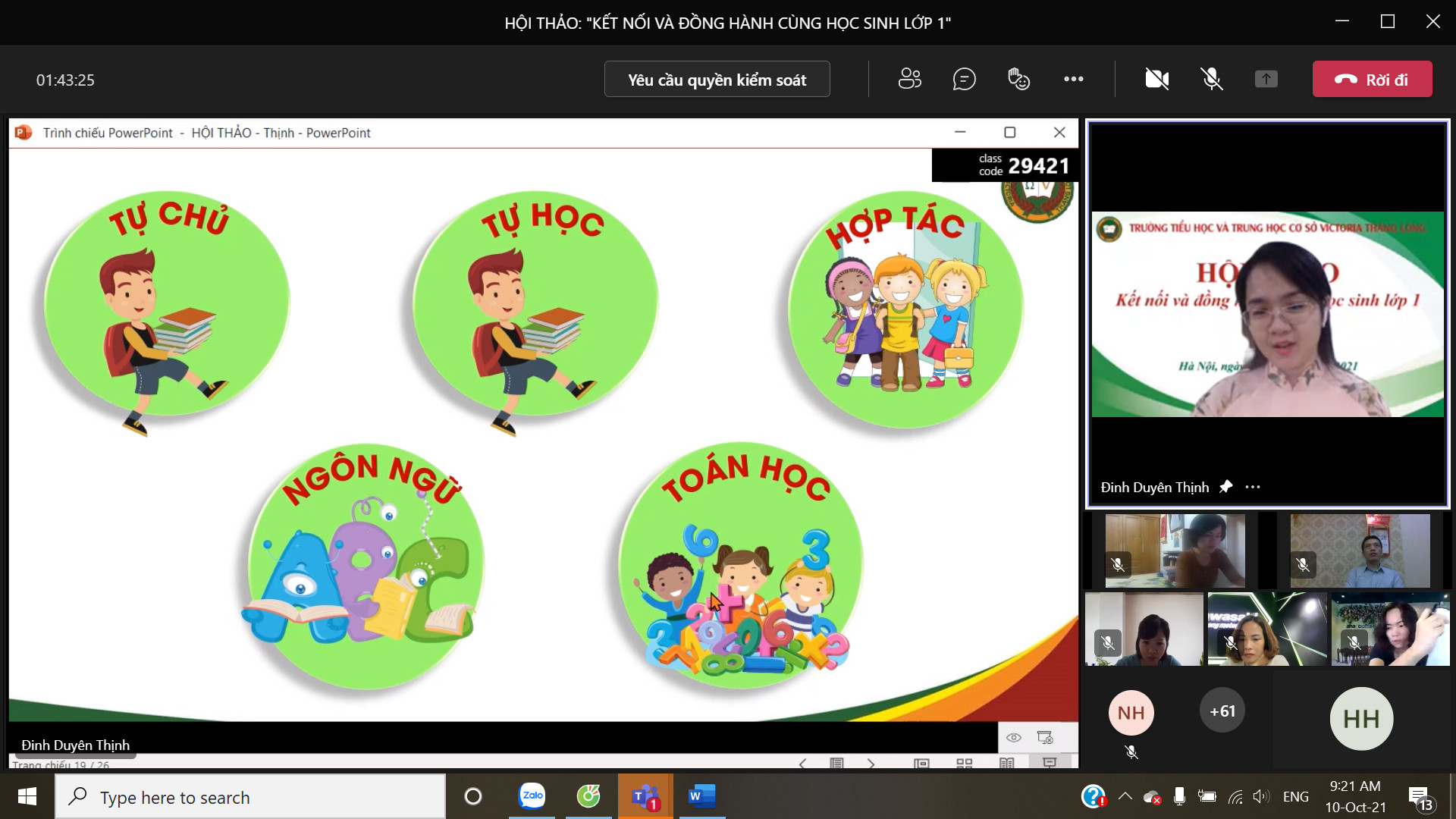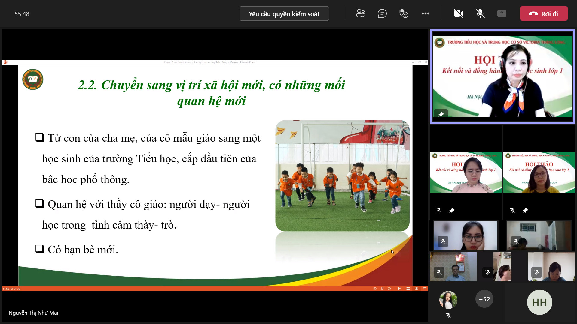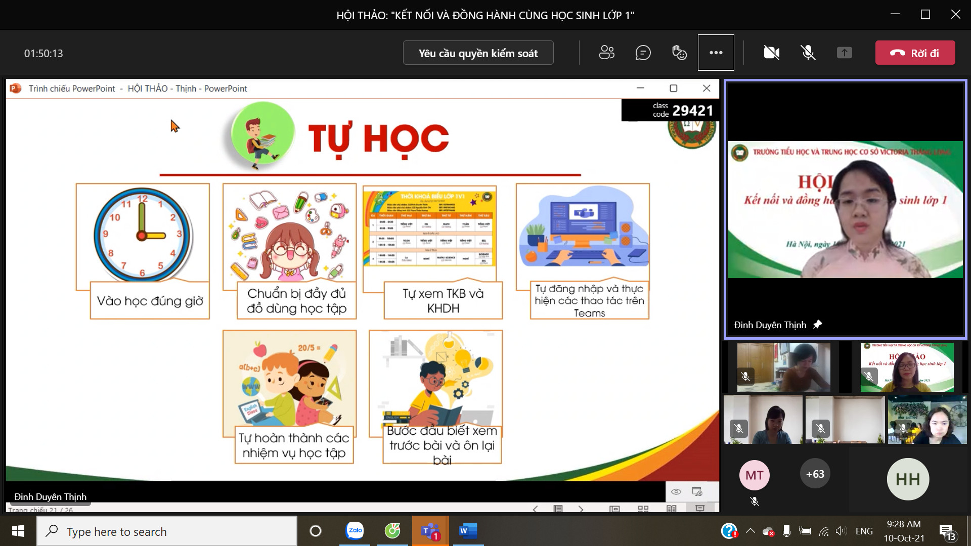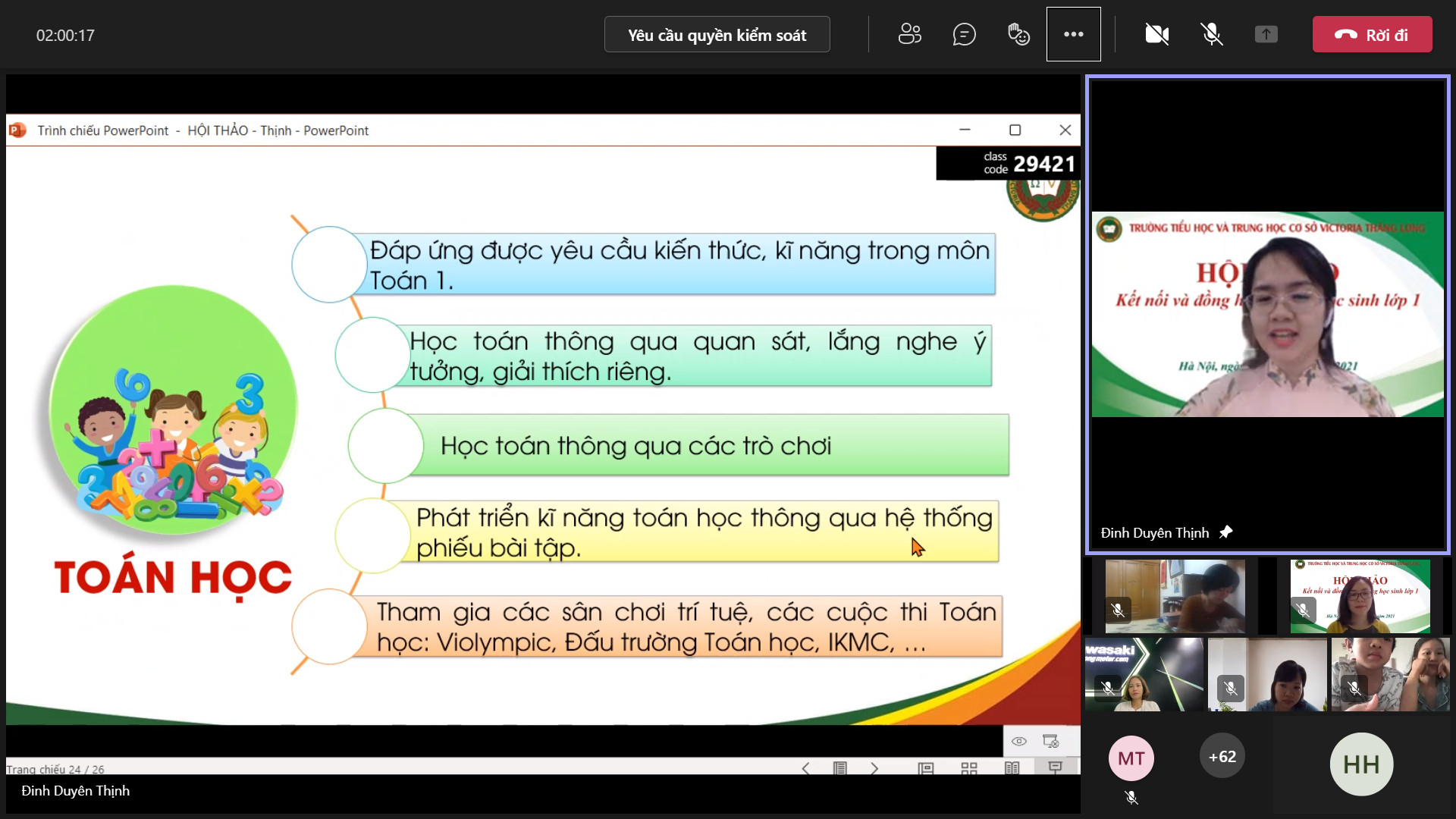 8h00 ngày 10/10/2021 Trường Tiểu học và Trung học cơ sở Victoria Thăng Long đã tổ chức Hội thảo trực tuyến chia sẻ, tư vấn với chủ đề: “Victoria Thăng Long đồng hành cùng học sinh lớp 1”. Buổi Hội thảo được tổ chức trên nền tảng Microsoft Teams và phát trực tiếp trên kênh Fanpage của Nhà trường đã thu hút được sự quan tâm của đông đảo của quý vị phụ huynh và thầy, cô giáo.