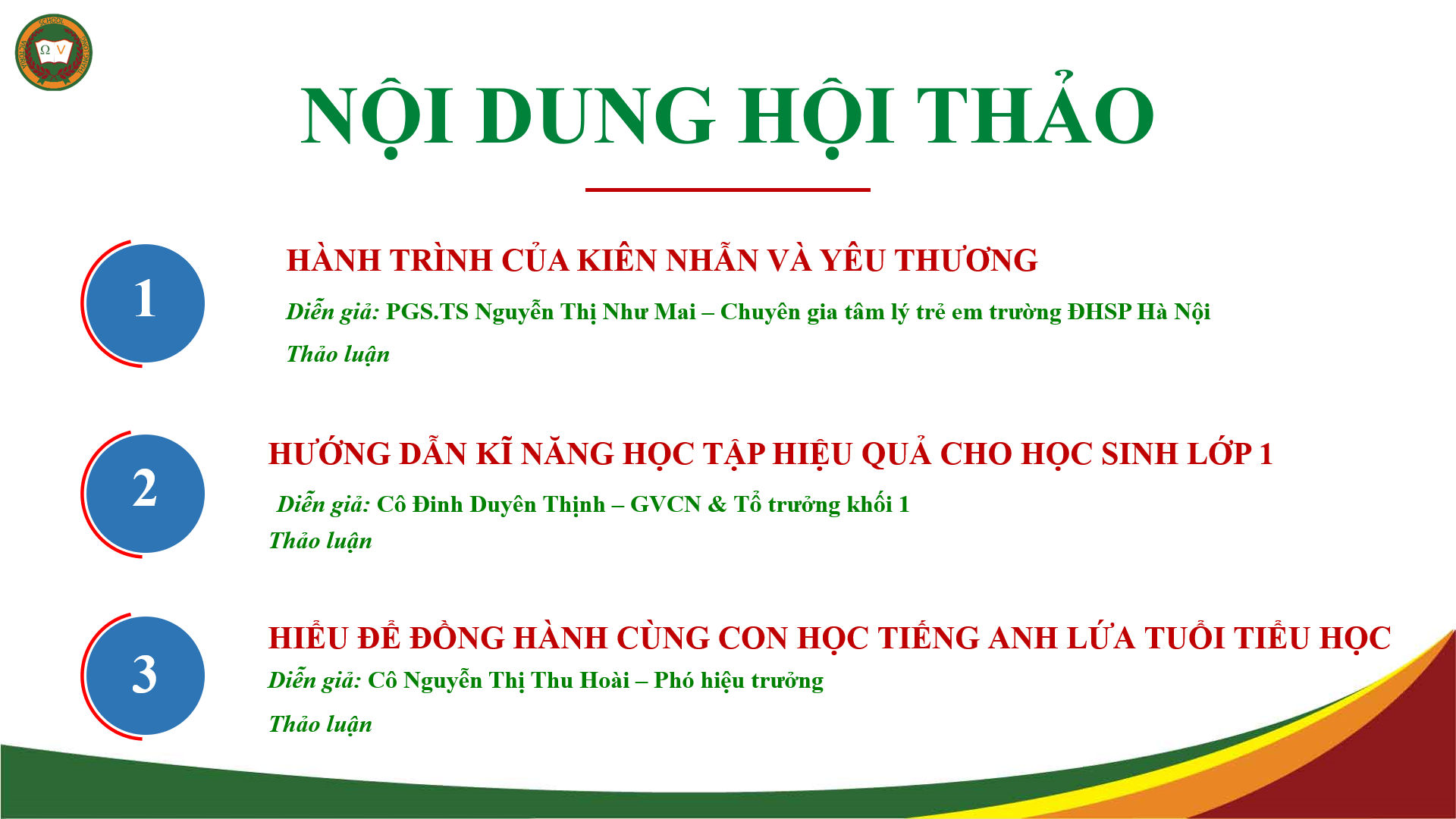 Chương trình Hội thảo được thực hiện bởi PGS.TS Nguyễn Thị Như Mai – Chuyên gia Tâm lý học trẻ em, giảng viên sư phạm – diễn giả chương trình “Kết nối và hỗ trợ” của Trường Đại học Sư phạm Hà Nội, cô Nguyễn Thị Thu Hoài – Phó hiệu trưởng Nhà trường và cô Đinh Duyên Thịnh – Trưởng Khối 1 trường Tiểu học và THCS Victoria Thăng Long.